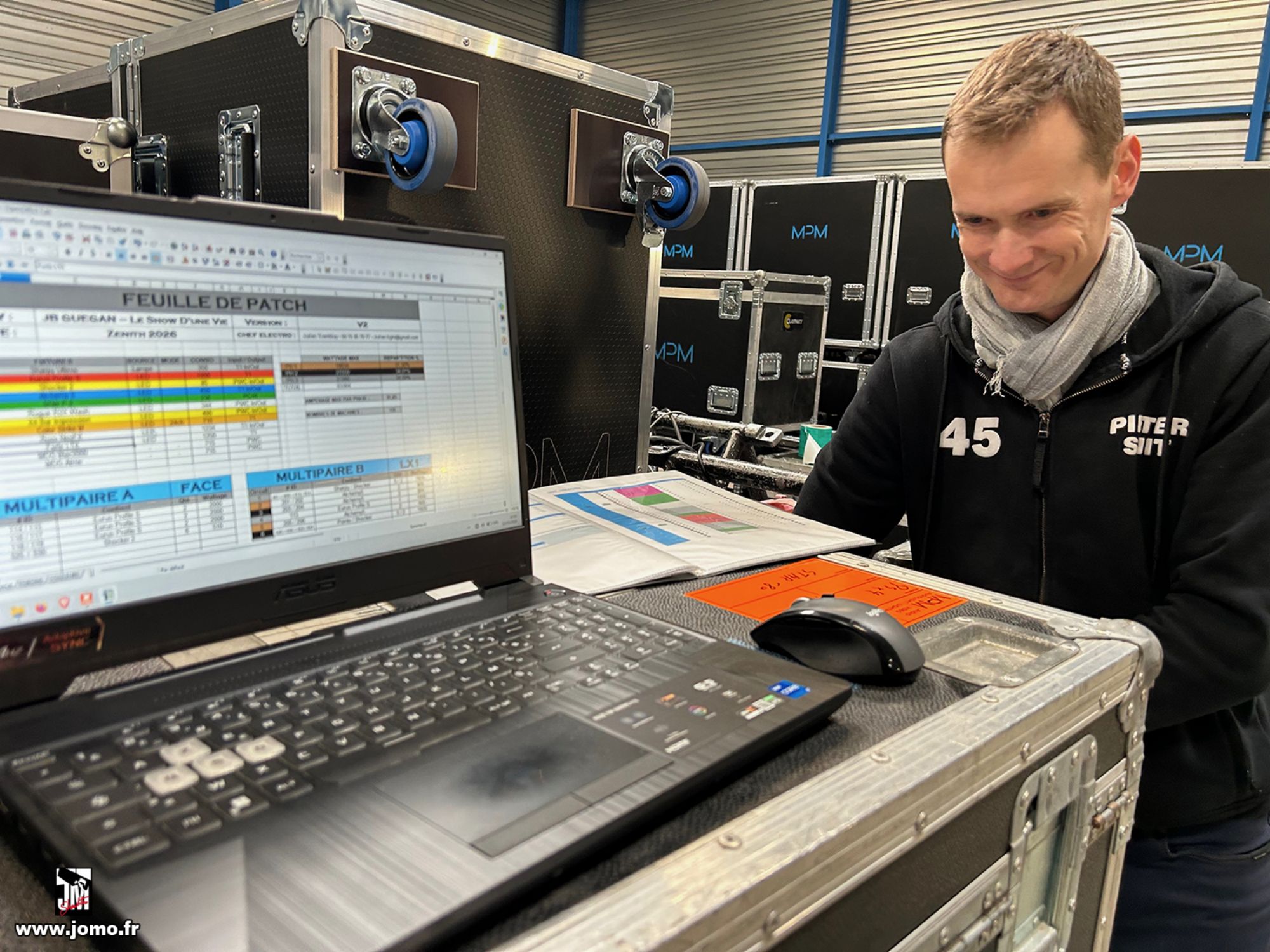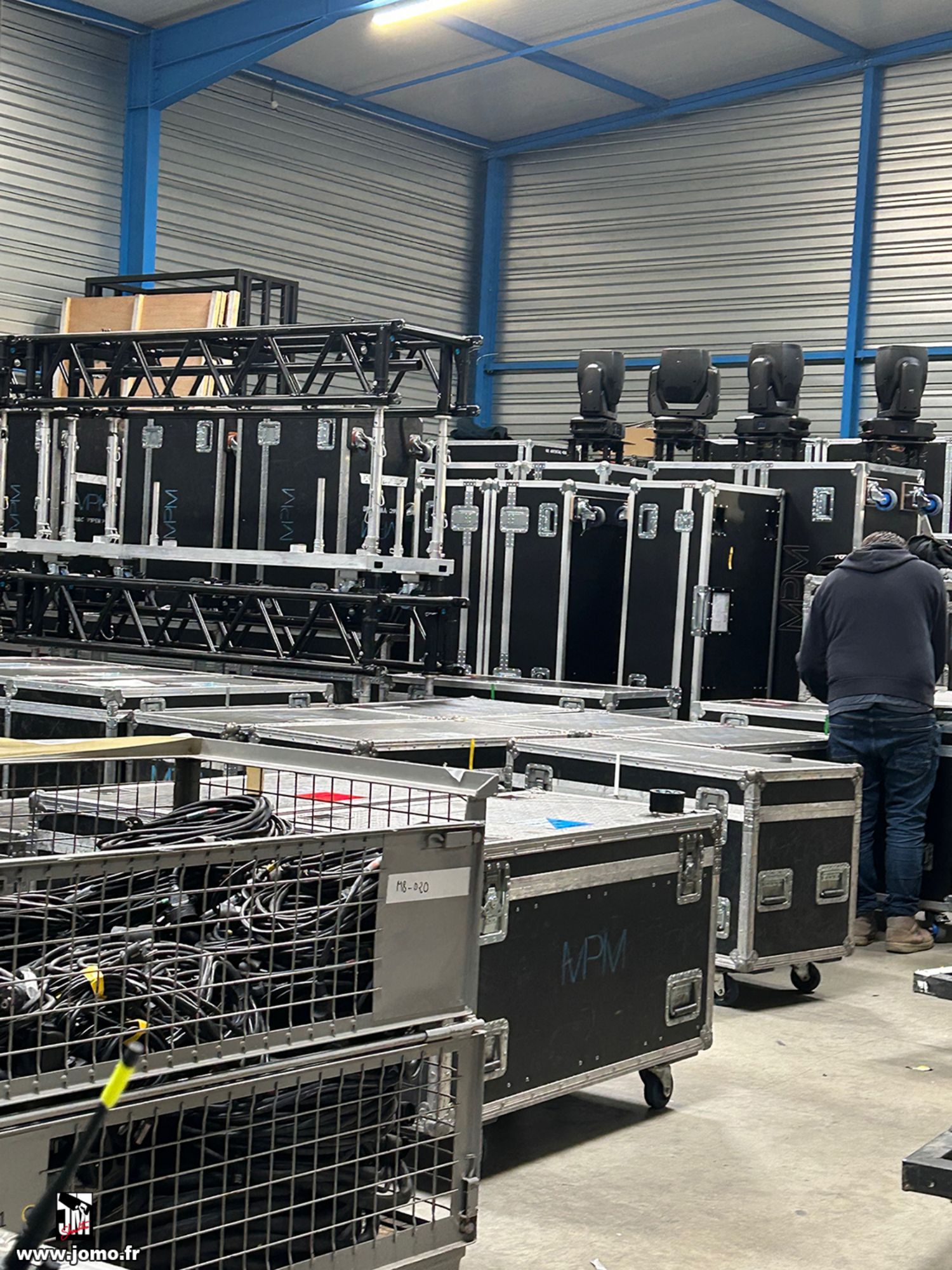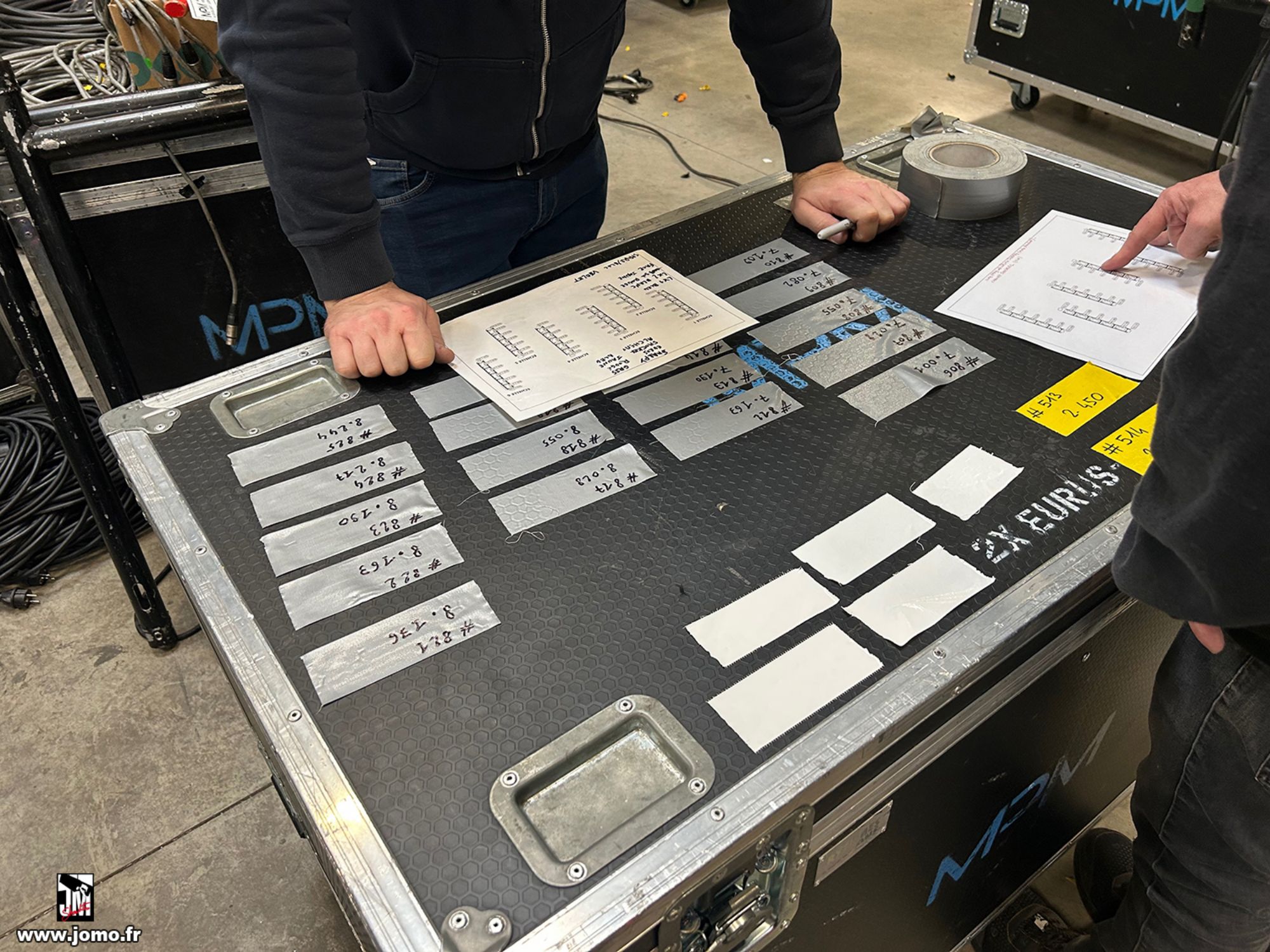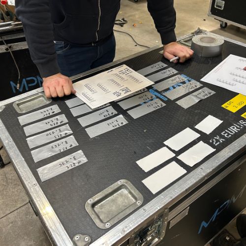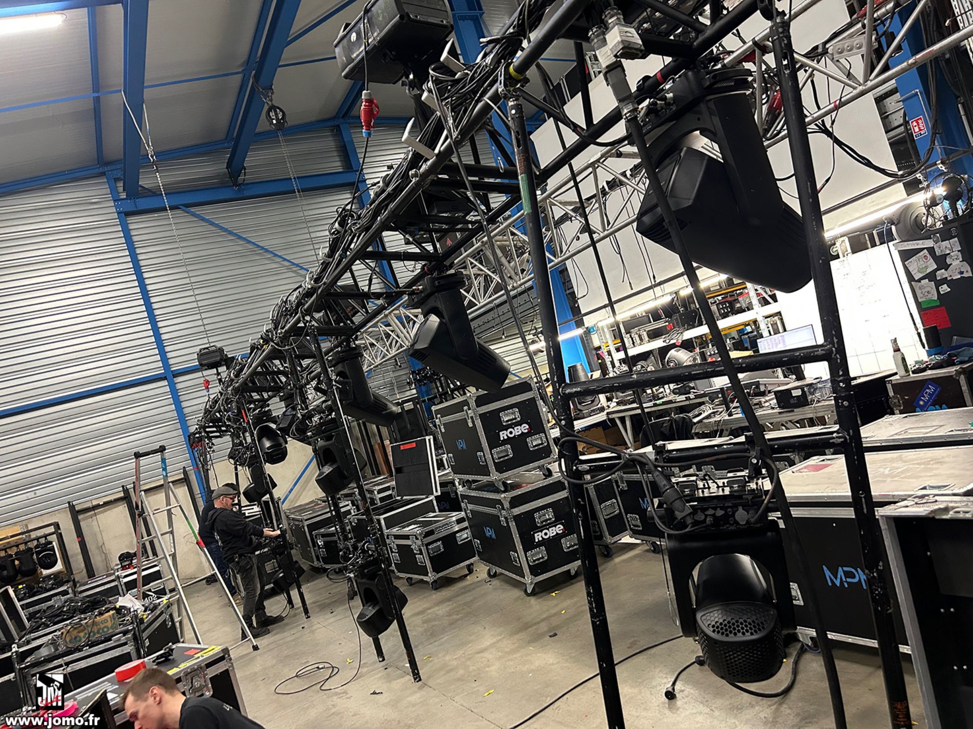 Quelques images de préparatifs chez le prestataire MPM (à Woippy près de Metz), avec l'etiquettage, préparation de torons, compte de câblage, d'équipement, de projecteurs, etc... en vue de la tournée de Zeniths de Jean-Baptiste GUEGAN "Johnny, le show d'une vie".